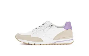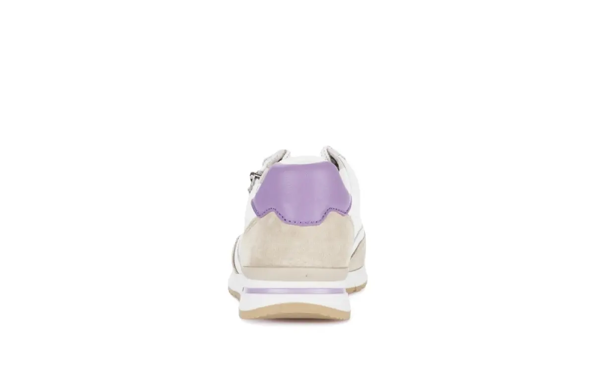 eze witte Gabor basket heeft een frisse, moderne uitstraling met een subtiele speelse twist dankzij het lila accent op de hiel. De combinatie van zacht nappaleer en suèdedetails zorgt voor een luxueuze look die je moeiteloos combineert met al je voorjaars- en zomeroutfits. Dankzij de wijdte G sluit de basket comfortabel aan bij de gemiddelde voet. Het losse voetbed kun je eenvoudig vervangen door je eigen inlegzolen voor een persoonlijke pasvorm. De lichte zool met aangename demping ondersteunt elke stap en maakt deze basket ideaal voor lange dagen op pad. Of je hem nu draagt bij een jeans, linnen broek of sportieve jurk, deze witte basket brengt stijl en comfort perfect samen.