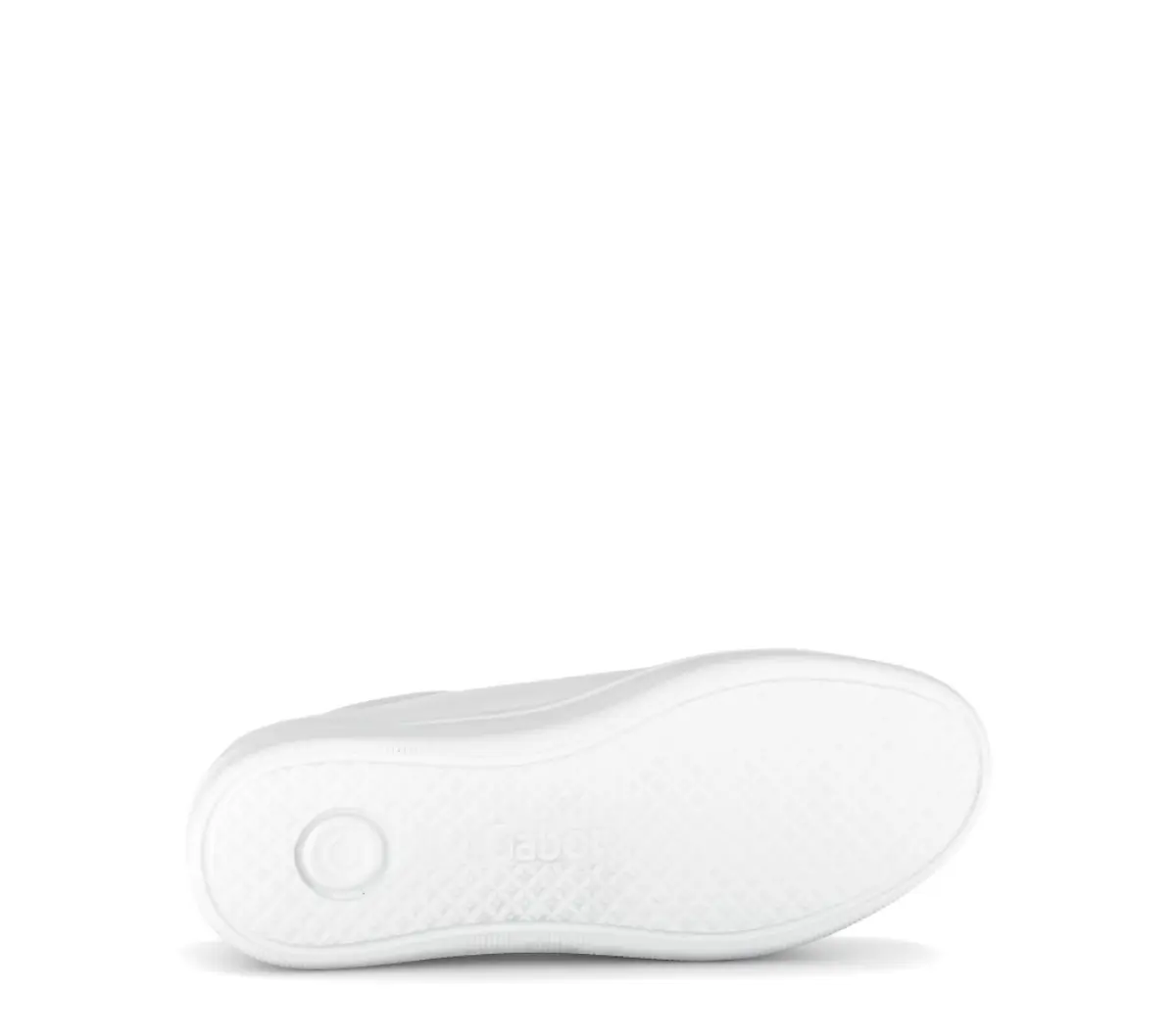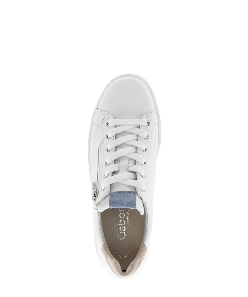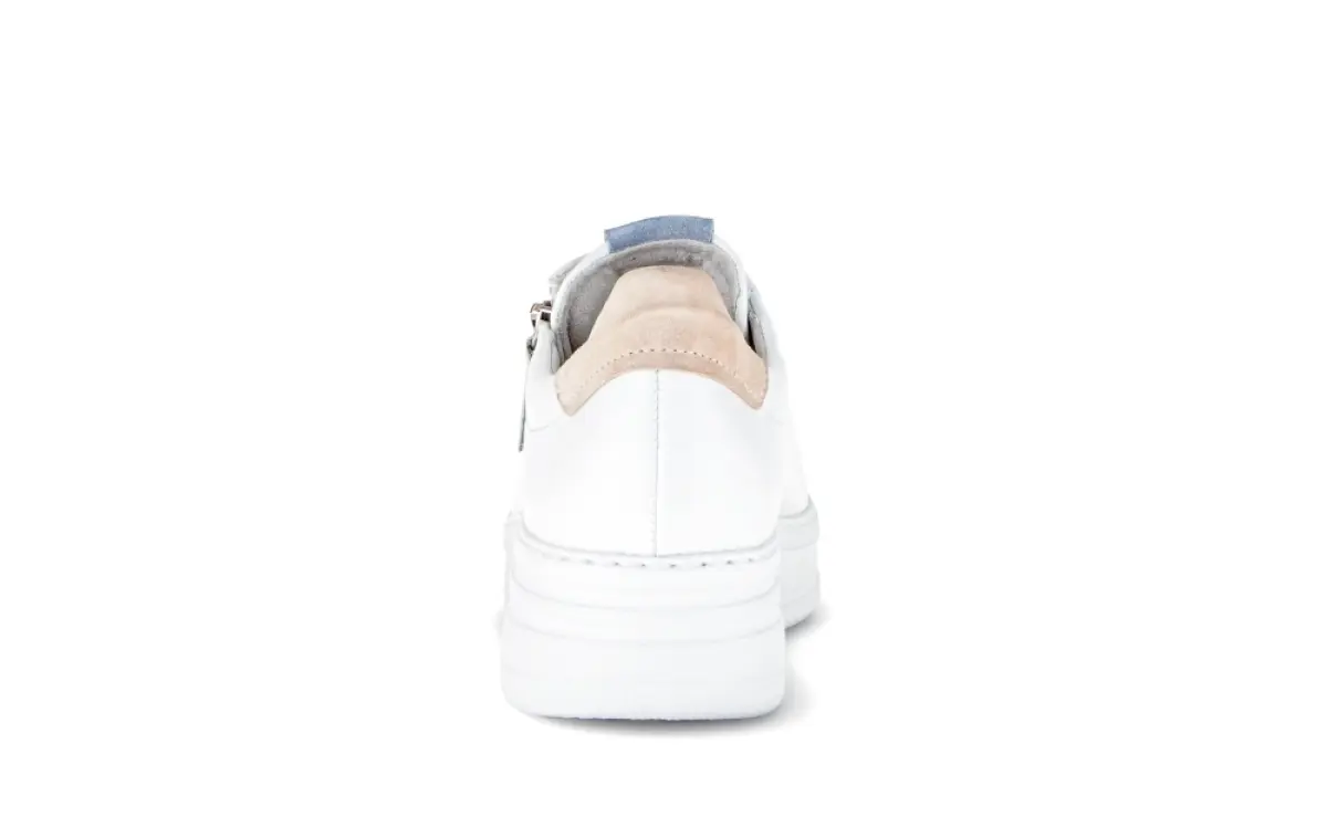 Deze witte basket van Gabor is een stijlvolle klassieker met een frisse, moderne twist. Het gladde nappaleer voelt soepel aan en geeft de schoen een luxueuze uitstraling, terwijl de beige en blauwe accenten subtiel kleur en karakter toevoegen. De stevige plateauzool zorgt voor een eigentijdse look én biedt extra comfort bij elke stap. Dankzij de wijdte G sluit deze basket prettig aan rond je voet, terwijl het losse voetbed het mogelijk maakt om je eigen inlegzolen te gebruiken voor een persoonlijke pasvorm. Of je nu kiest voor een casual jeans of een luchtige zomeroutfit, deze witte basket voegt altijd een vleugje elegantie en draagcomfort toe aan je look.