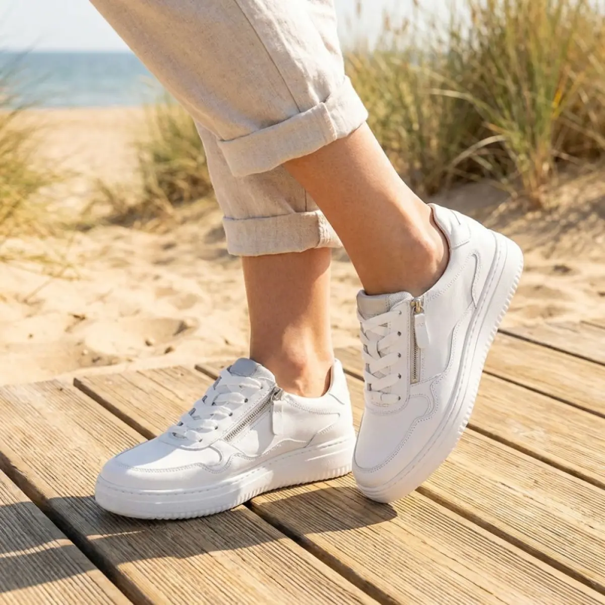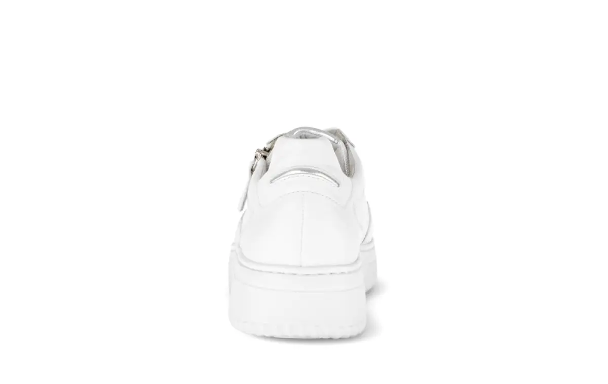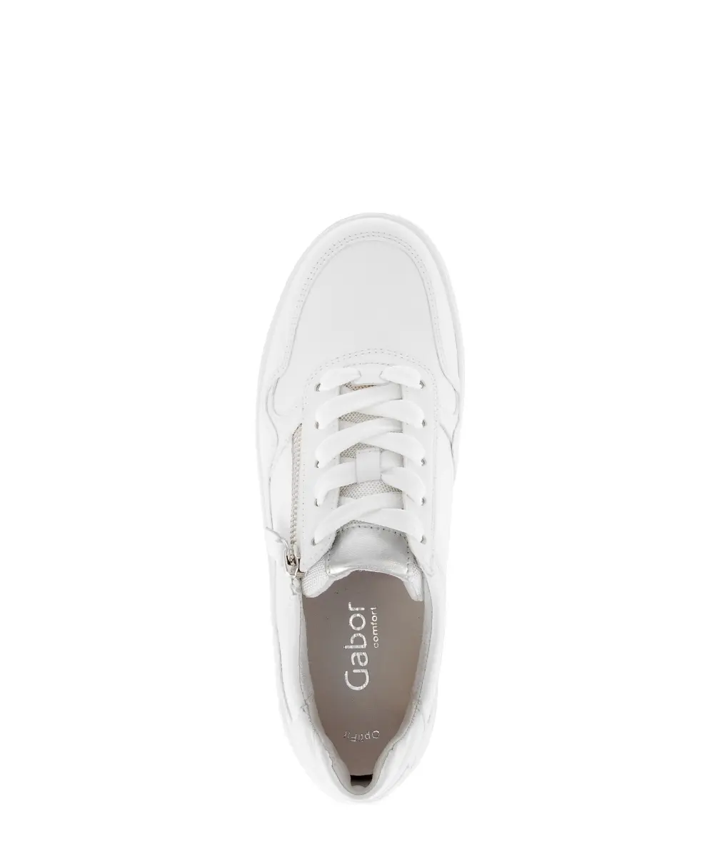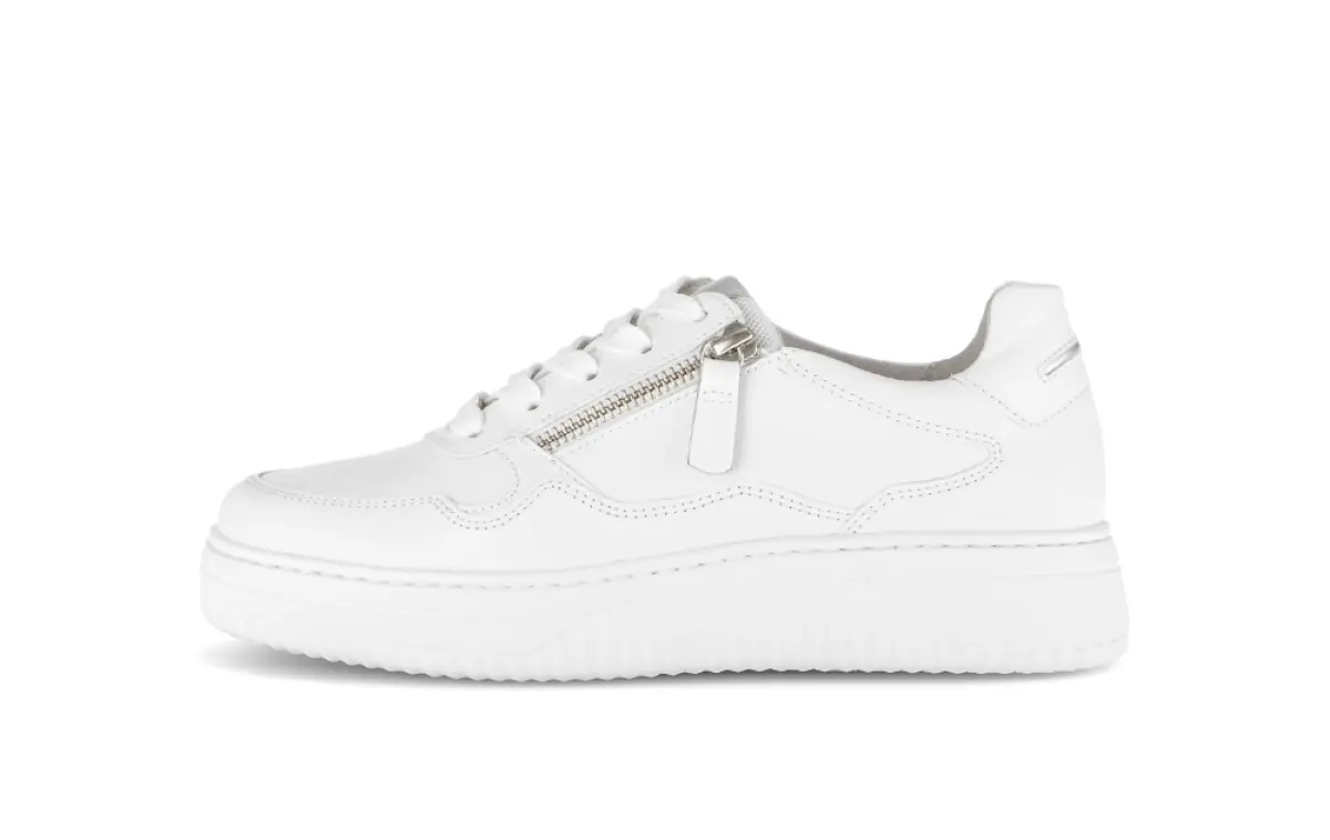 Deze witte Gabor sneaker van nappaleer is een tijdloze klassieker met een moderne twist. Het gladde leer voelt zacht aan en geeft de schoen een luxueuze uitstraling, terwijl de subtiele details en de zilverkleurige rits zorgen voor extra gemak bij het aan- en uittrekken. Dankzij het losse voetbed kun je moeiteloos je eigen inlegzolen gebruiken, wat het draagcomfort verhoogt. De wijdte K biedt extra ruimte en is ideaal als je graag wat meer bewegingsvrijheid aan de voorvoet hebt. De robuuste witte zool zorgt voor een sportieve look én biedt uitstekende demping bij elke stap. Deze witte Gabor sneaker is een veelzijdige keuze voor dagelijks gebruik en past perfect bij een casual jeans of een stijlvolle, ontspannen outfit.