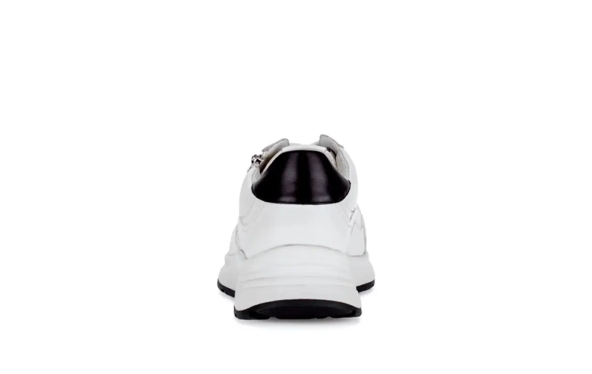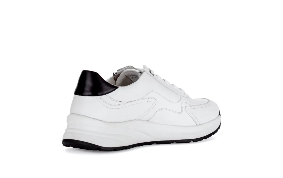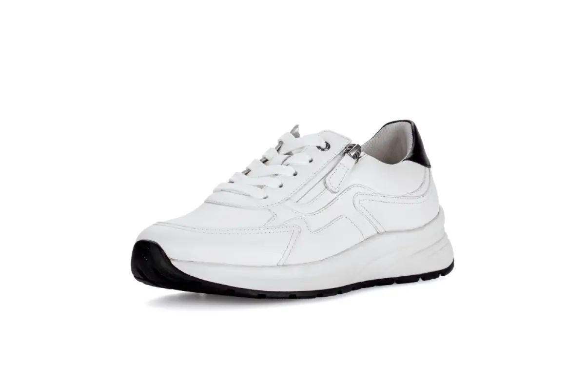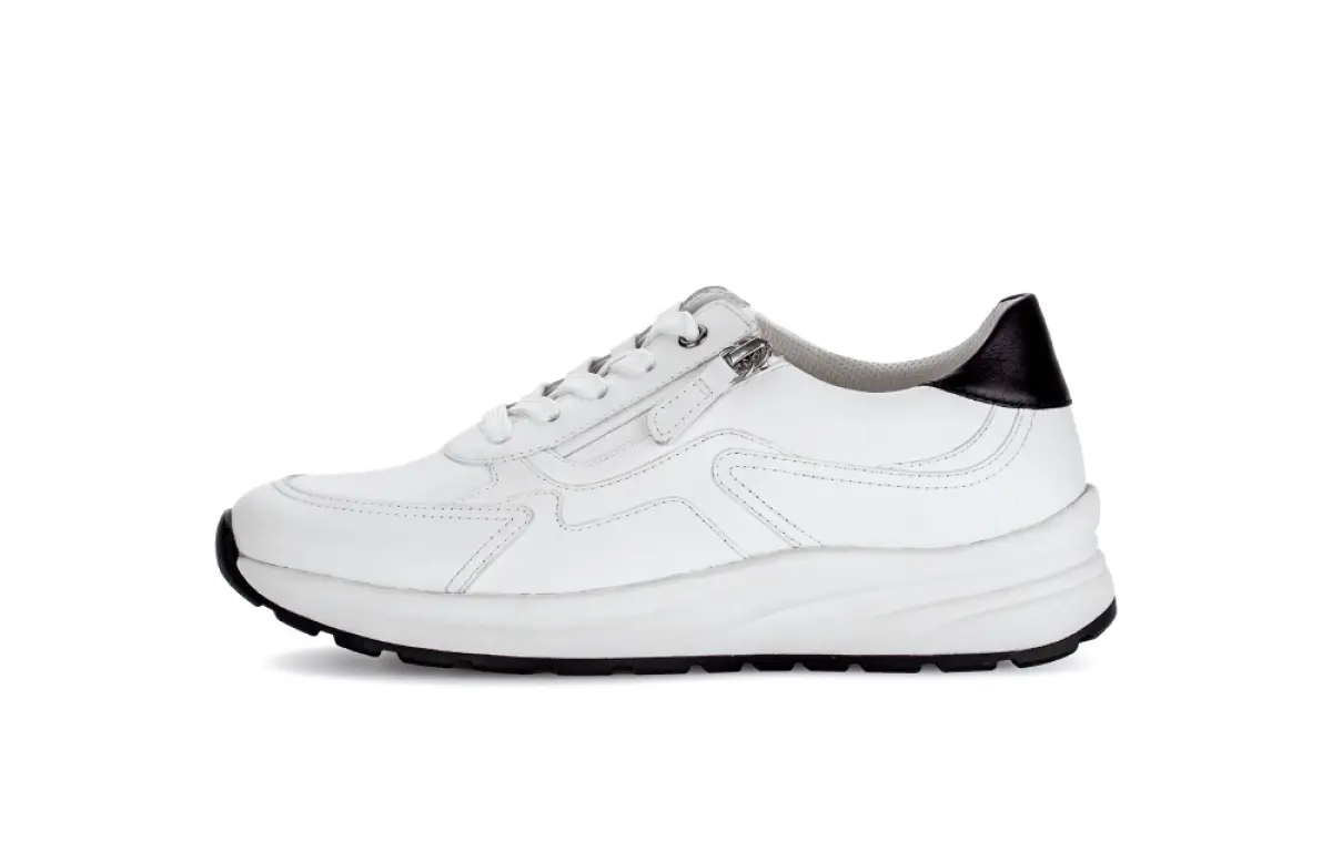 Deze witte Gabor basket van nappaleer heeft een moderne en sportieve uitstraling. De zwarte hiel zorgt voor een subtiel contrast dat de basket een frisse en tijdloze look geeft. Het gladde leer voelt soepel aan en vormt zich prettig naar je voet. Hierdoor past deze basket bij zowel casual als elegante outfits. De verhoogde zool geeft een modieuze touch en biedt tegelijk extra demping. Het losse voetbed maakt de basket geschikt voor eigen inlegzolen. Dankzij de wijdte K heeft je voet meer ruimte, zonder dat de pasvorm verloren gaat. De stevige maar flexibele zool ondersteunt elke stap en voelt comfortabel aan bij dagelijks gebruik. De ritssluiting naast de veters maakt het aan- en uittrekken extra eenvoudig. Deze basket is een veelzijdige keuze voor wie stijl, draaggemak en modern design wil combineren.