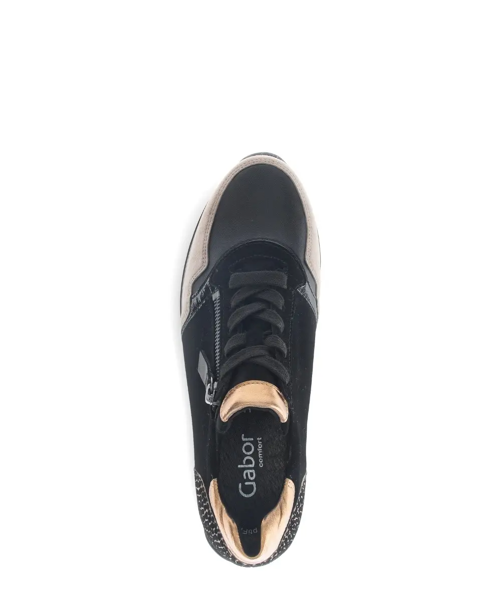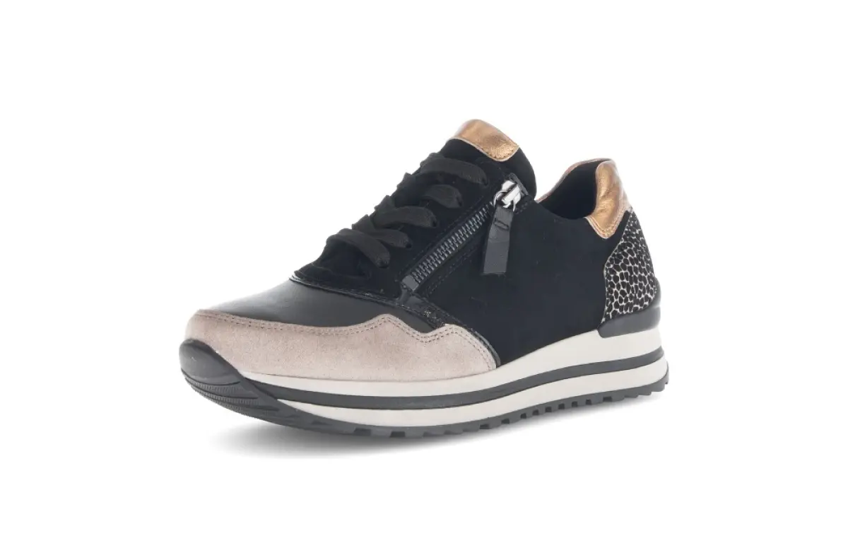 Deze zwarte Gabor sneaker van soepel suède biedt extra ruimte dankzij wijdte H, perfect voor wie nét iets meer comfort zoekt zonder in te leveren op stijl. Het zachte suède voelt zacht aan en oogt warm en elegant, terwijl de de subtiele dierenprint op de hak zorgt voor een modieuze touch. Dankzij de combinatie van veters en ritssluiting trek je deze schoen makkelijk aan en uit. Gun je voeten de luxe van comfort en stijl in één en bestel nu jouw nieuwe favoriet.